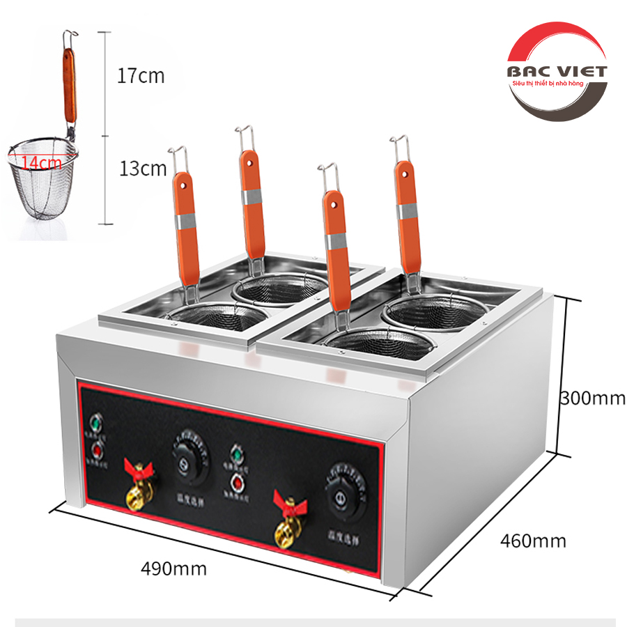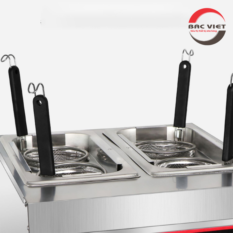 Trụng 4 món cùng lúc: Với 4 họng/ngăn trụng độc lập, bạn có thể trụng đồng thời 4 suất mì, bún hoặc phở khác nhau chỉ trong vòng 30-60 giây. Tốc độ này giúp phục vụ khách hàng nhanh chóng, đặc biệt quan trọng trong các giờ cao điểm.