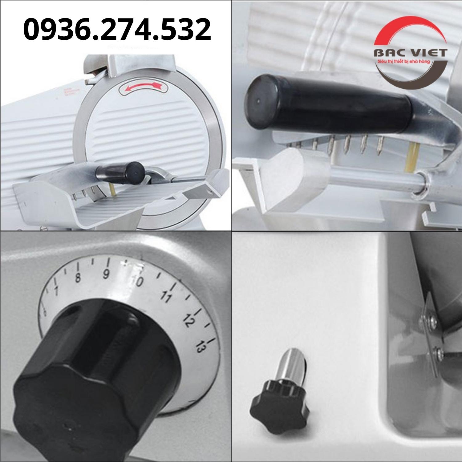 Hệ thống điều khiển (bảng điều khiển, nút dừng khẩn cấp, điều chỉnh độ dày lát, tốc độ cắt) giúp vận hành linh hoạt.