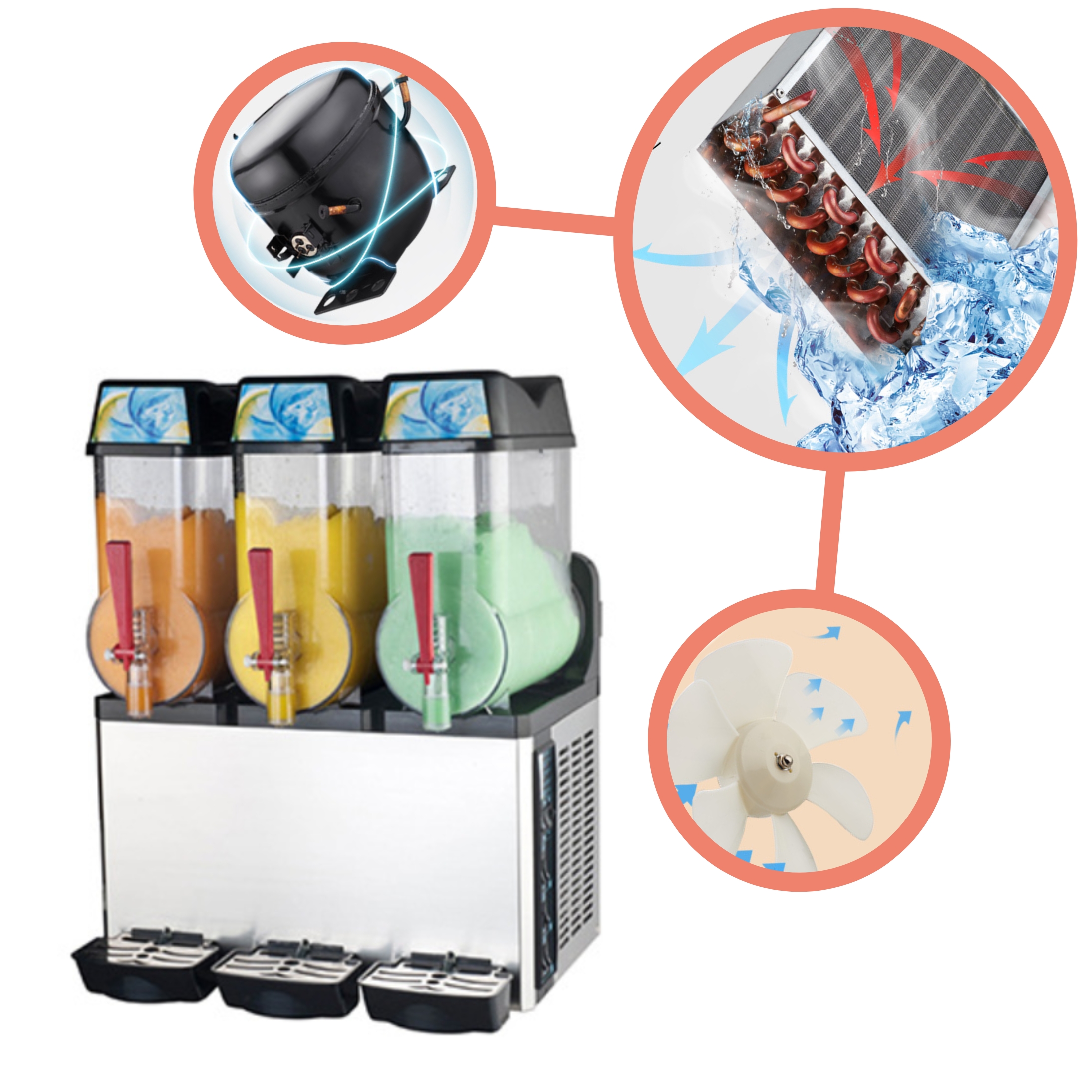 3 bình chứa riêng biệt, chế biến đồng thời ba loại đồ uống hoặc ba hương vị khác nhau (trà sữa, đá tuyết trái cây, bingsu sô-cô-la…).
