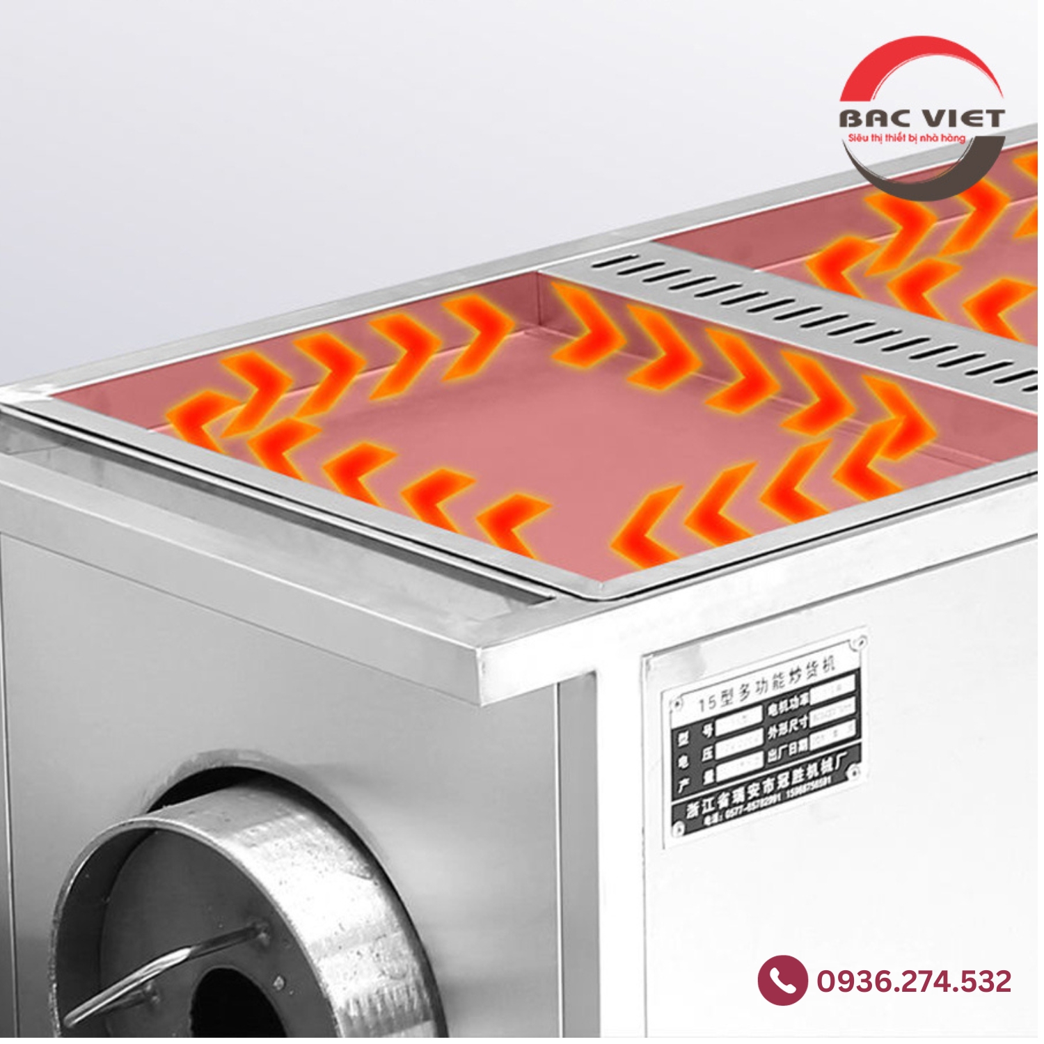 Hệ thống gia nhiệt ổn định, có thể điều chỉnh nhiệt độ dễ dàng tùy loại hạt: hạt dẻ, hạt điều, đậu phộng, hạt sen, ngô, cà phê,...