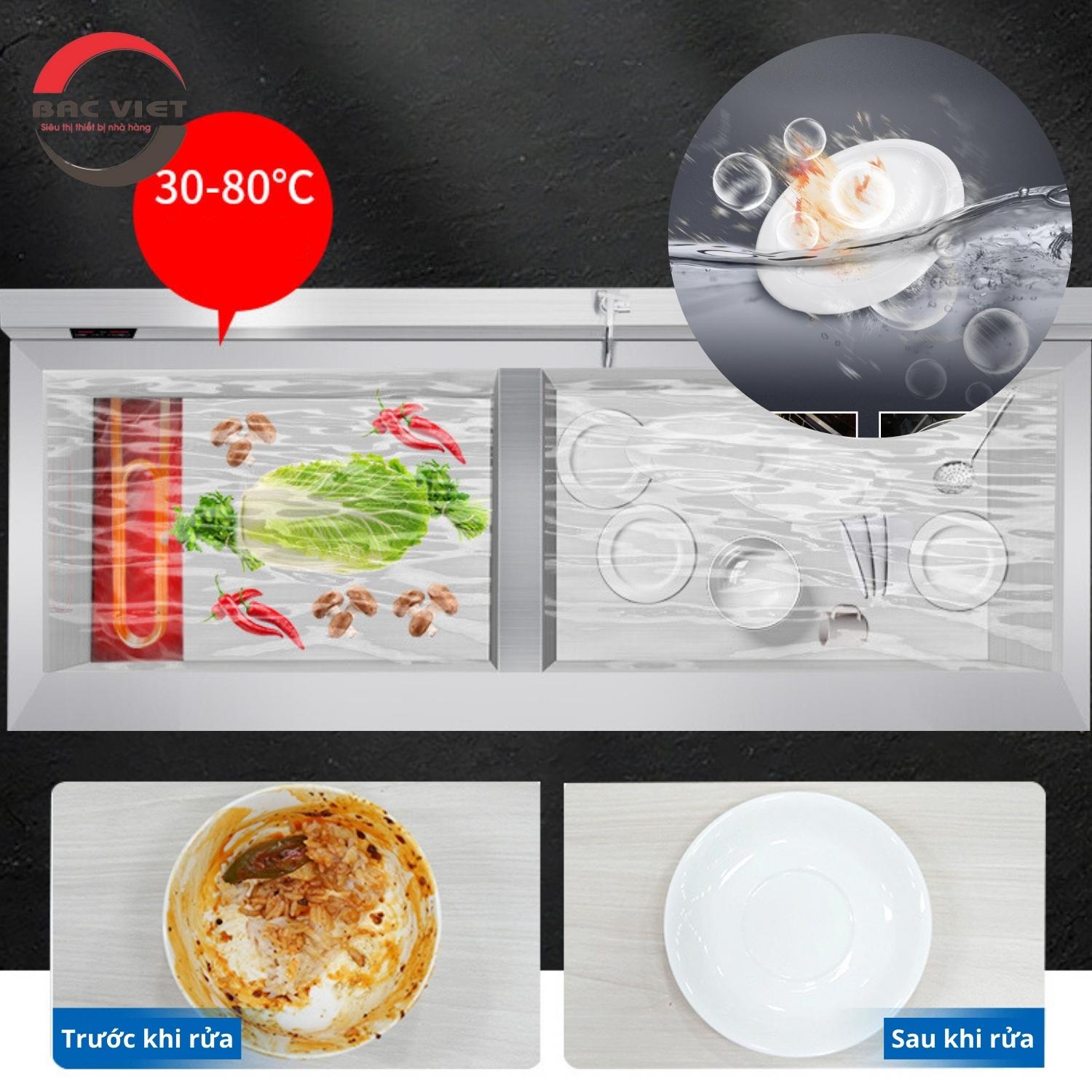 Thiết bị này còn đảm bảo vệ sinh an toàn thực phẩm nhờ sử dụng nước nóng ở nhiệt độ cao, có khả năng loại bỏ vi khuẩn, dầu mỡ và mùi hôi, đáp ứng các tiêu chuẩn vệ sinh nghiêm ngặt.