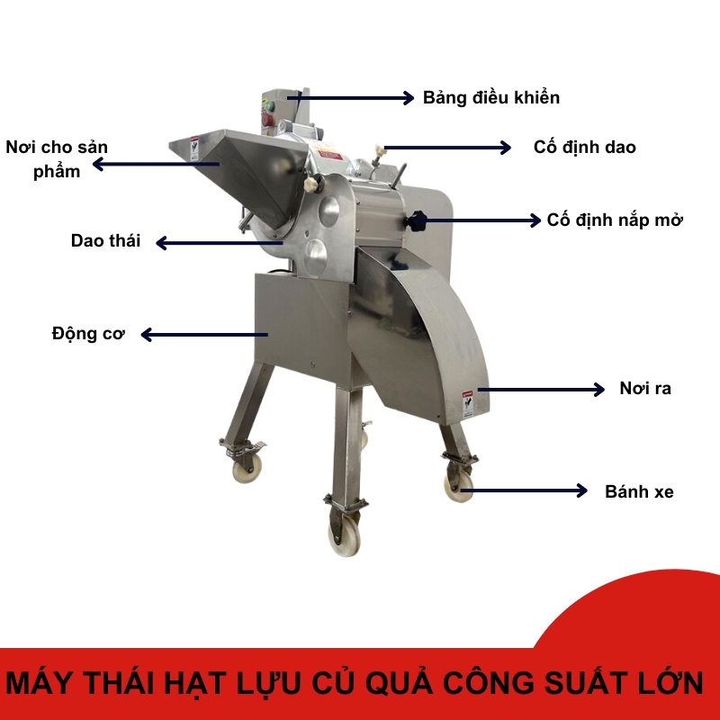 Thiết bị hoạt động bằng hệ thống lưỡi dao sắc bén, giúp cắt nhanh, chính xác và giảm thiểu hao hụt nguyên liệu.