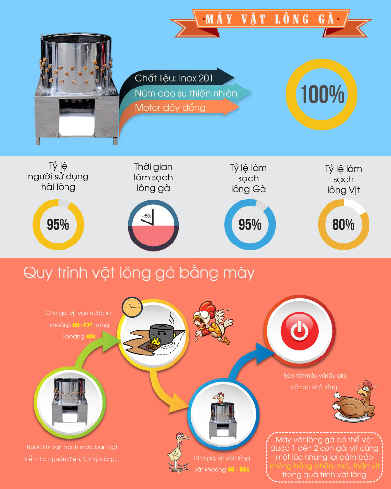 Máy vặt lông gà là thiết bị chuyên dụng được sử dụng để loại bỏ lông gà, vịt và các loại gia cầm khác sau khi làm thịt. Nhờ cơ chế quay kết hợp với các thanh cao su chuyên dụng, máy có thể làm sạch lông nhanh chóng mà không làm ảnh hưởng đến chất lượng thịt.