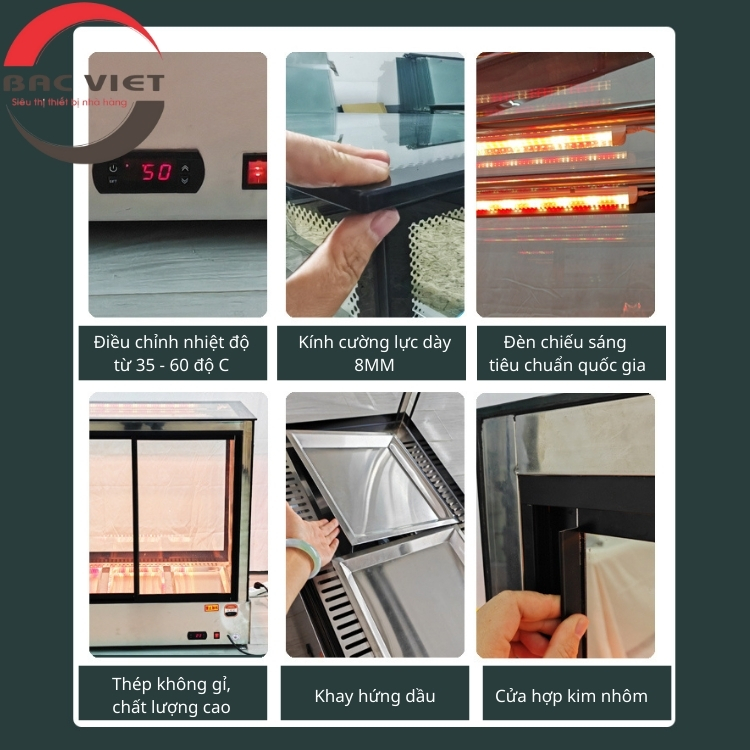 Giữ nóng và trưng bày các món quay, nướng, chiên.