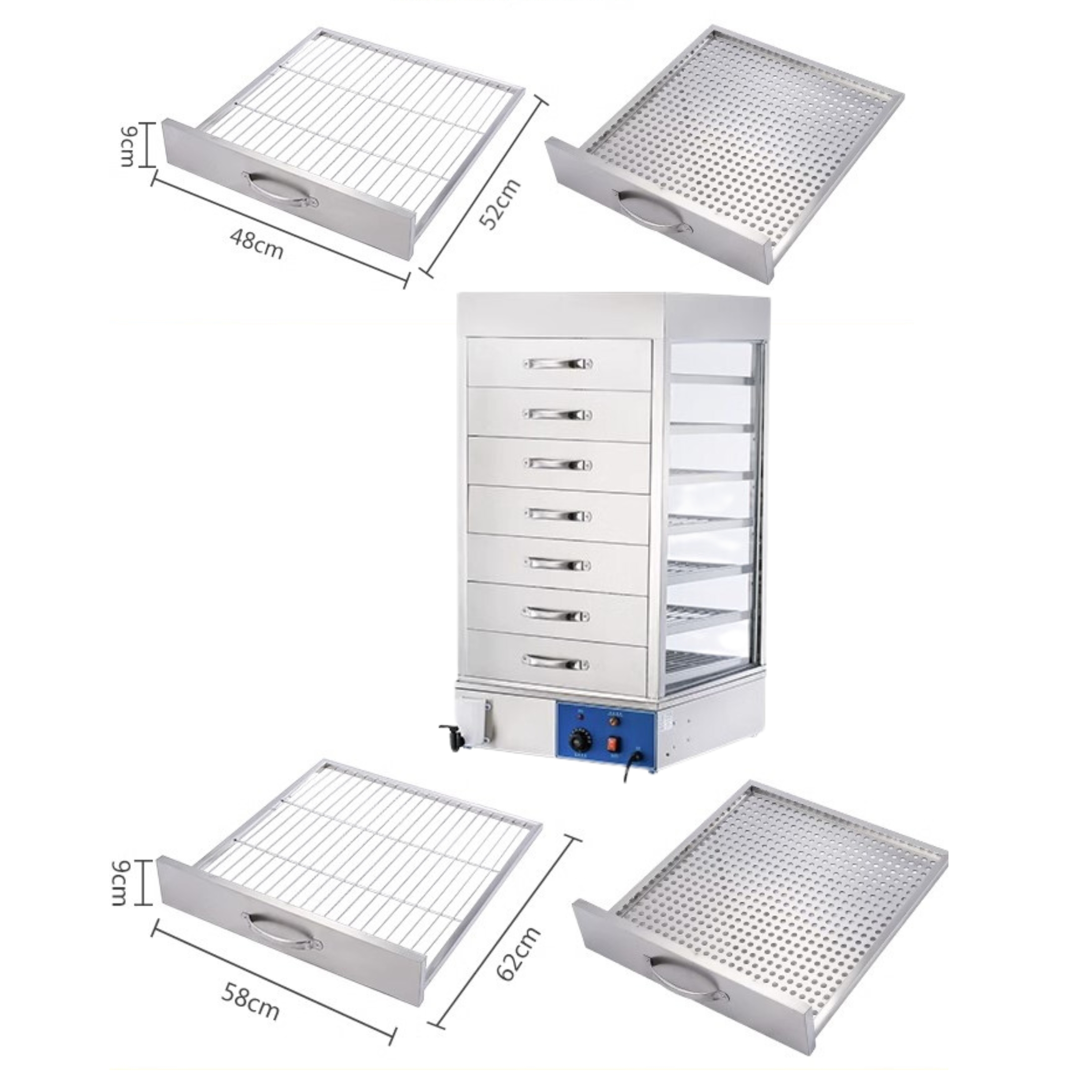 Tủ hấp bánh bao được thiết kế với nhiều tầng khay để sắp xếp bánh một cách gọn gàng. Hơi nước nóng sẽ phân bố đều trong tủ, giúp tất cả các khay bánh được hấp chín đồng đều.