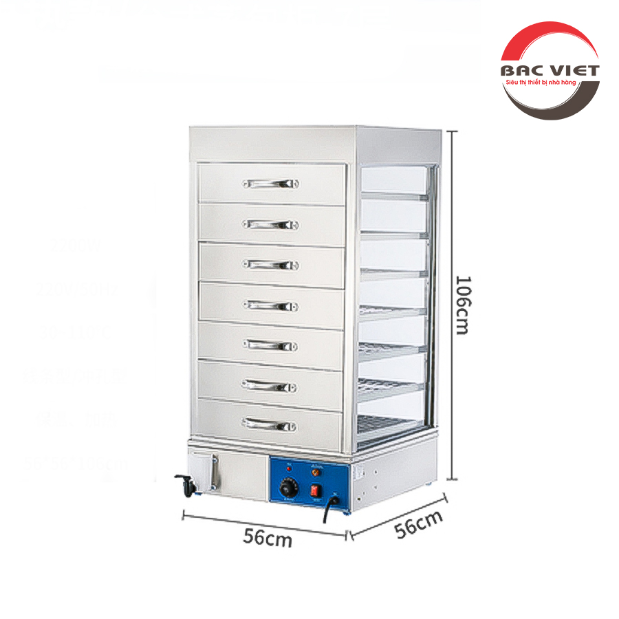 Thiết kế 7 tầng khay giúp trưng bày và giữ nóng số lượng bánh lớn, phù hợp cho quán bán hàng đông khách.