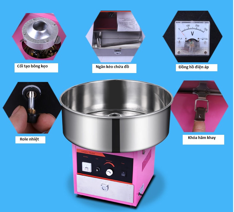 Máy làm kẹo bông là thiết bị dùng để sản xuất kẹo bông gòn từ đường cát thông qua quá trình gia nhiệt và quay ly tâm.